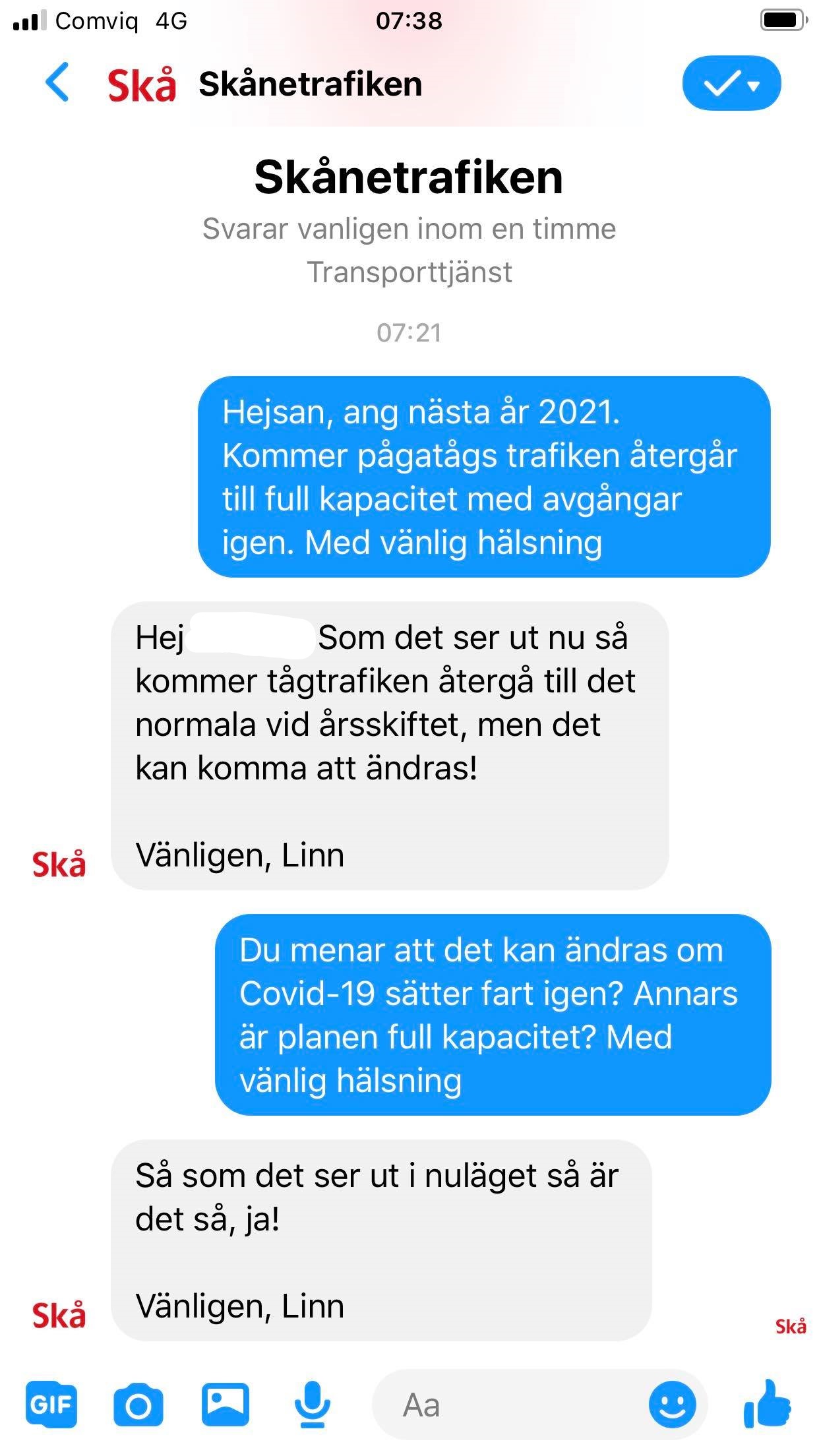 Vi sparar det bästa till sist. Skånetrafiken svarar själva på en rak fråga att trafiken kan vara i full gång vid årsskiftet om inte pandemin får ny fart. Vid full trafik krävs full arbetsstyrka och Arrivas möjligheter att säga upp framstår som tomma hot. Vi använder nu våra kontakter för att försöka få tydligare besked i frågan. Garantier kan vi nog inte räkna med dock pga pandemins nyckfullhet.